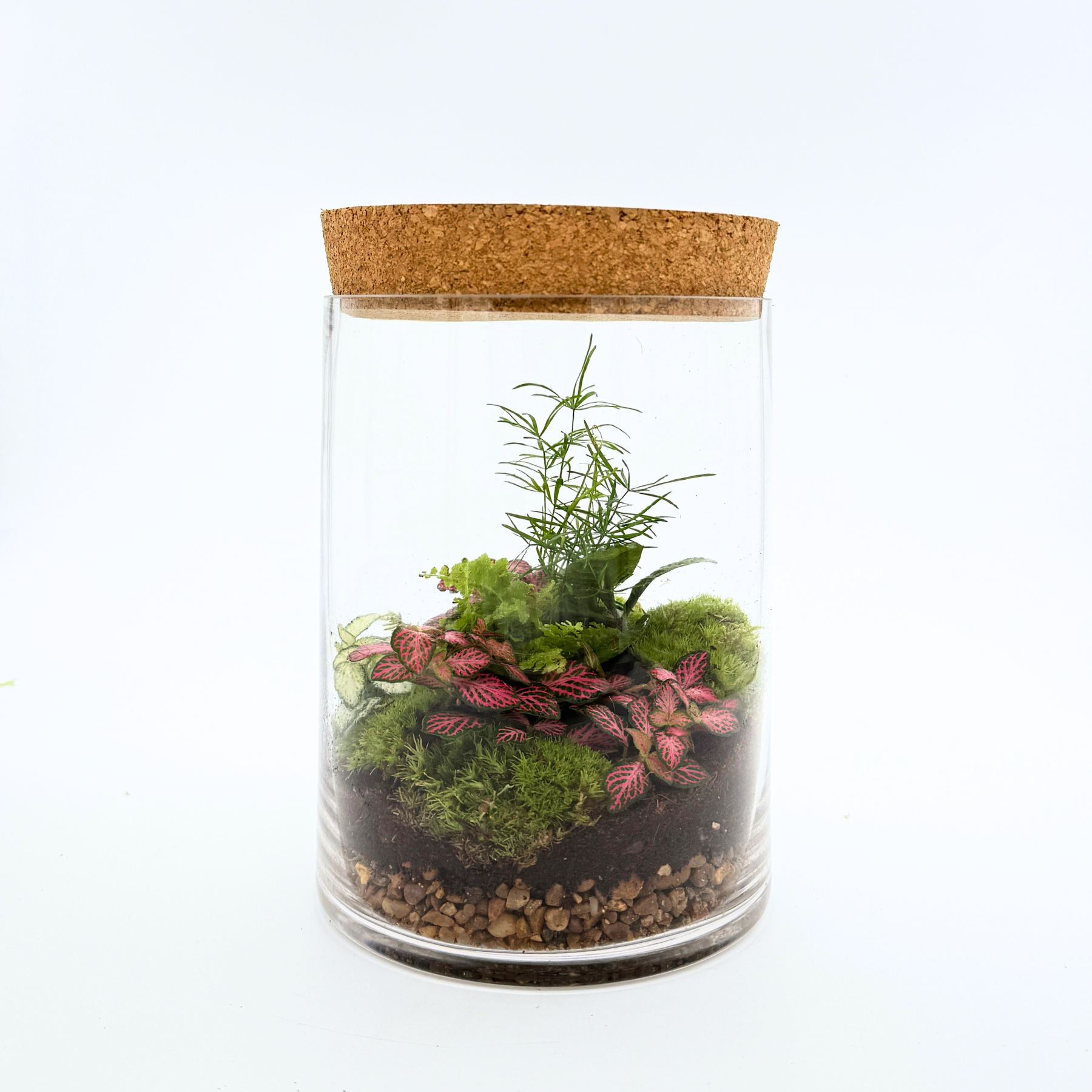 Each terrarium we build is completely unique, the Small Ficus Cylinder is simply planted with a central Ficus Ginseng tree, with a small Fittonia or two at the base and then surrounded by the freshest bun moss hills and finished with a careful placing of decorative stones.